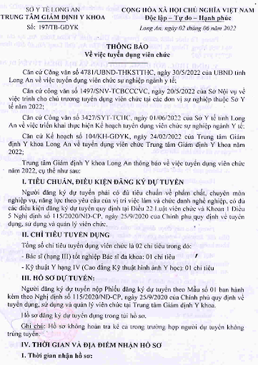 4. Nguyên văn thông báo Tuyển dụng viên chức tại Trung tâm Giám định Y khoa Long An